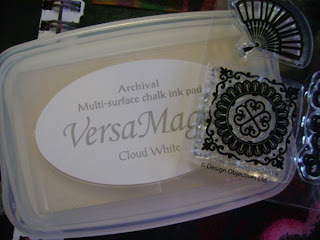 Next I chose a stamp and the Cloud White Vera Magic stamp pad and stamped over the top of the ribbon and in some other places